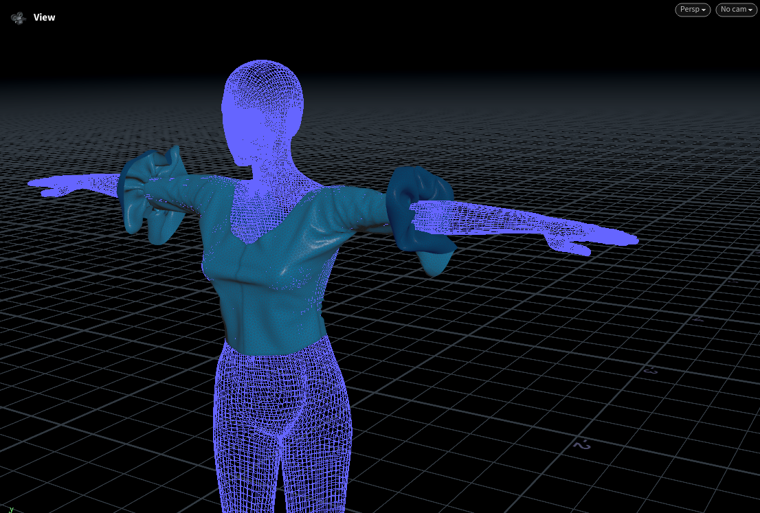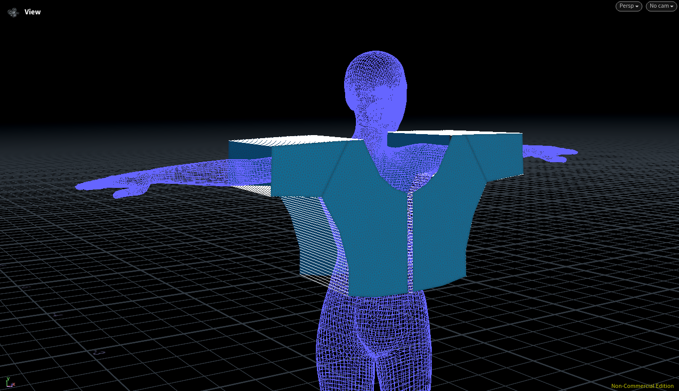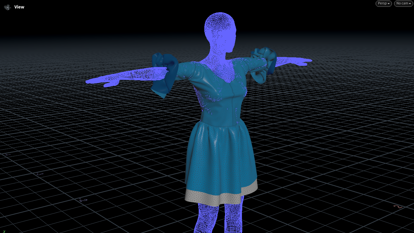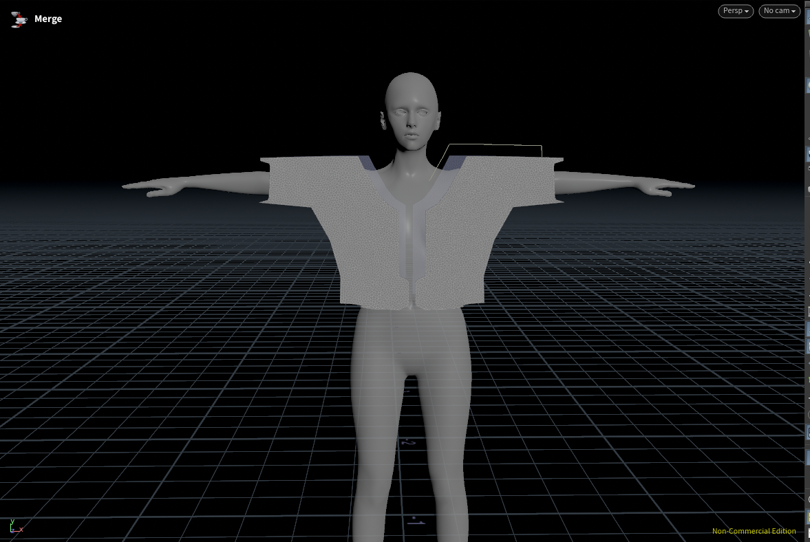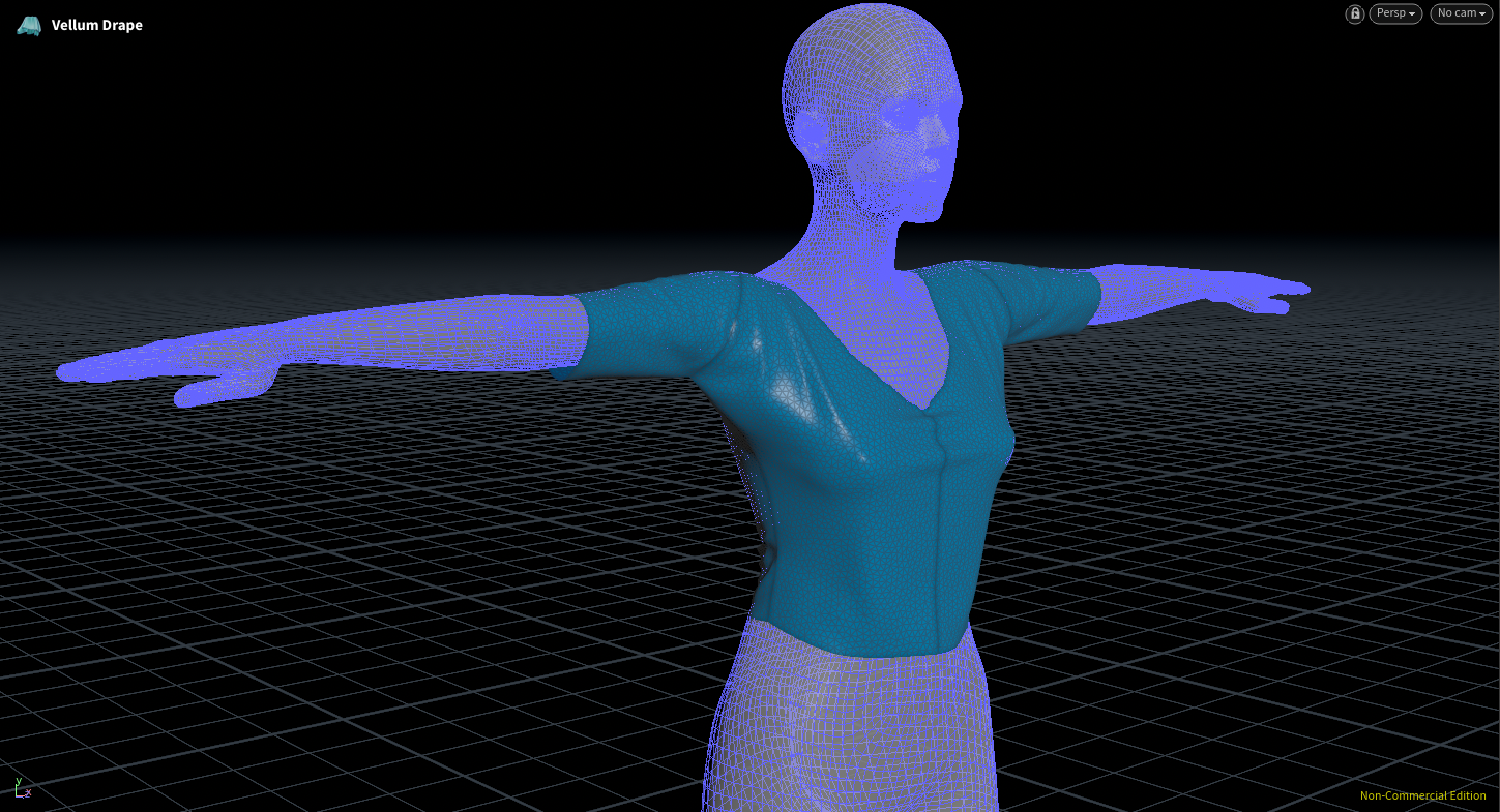 When I take the final drape in a Vellum solver for simulation, the most important parts are to attach the neckline and sleeves to the body of the model so that they stay in place.