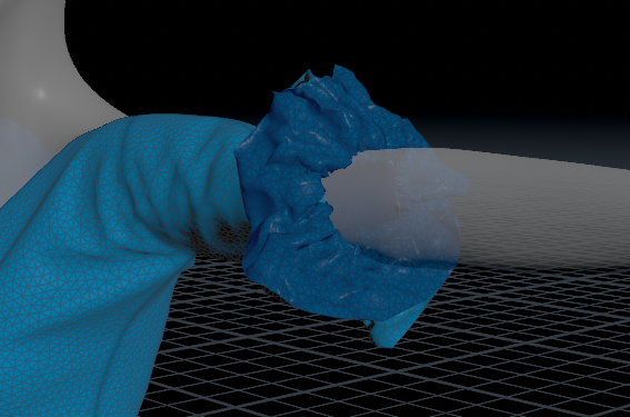 In the cloth constraints, I use high stretch and bend stiffness to preserve the overall form. I also have high compression stiffness to retain more fine detail from the wrinkles and folds. I found that if the mesh is able to contract too much, it appears more rubbery instead of cloth-like. When the besh is forced to bend instead of compress, it produces the nice fold detail we’d expect to see.